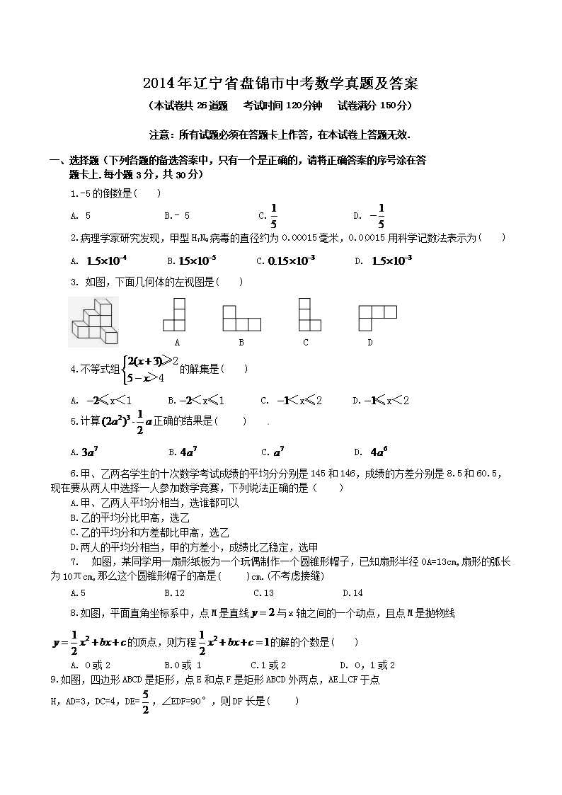 【文档名称】 2014年辽宁省盘锦市中考数学真题及答案(Word版).doc