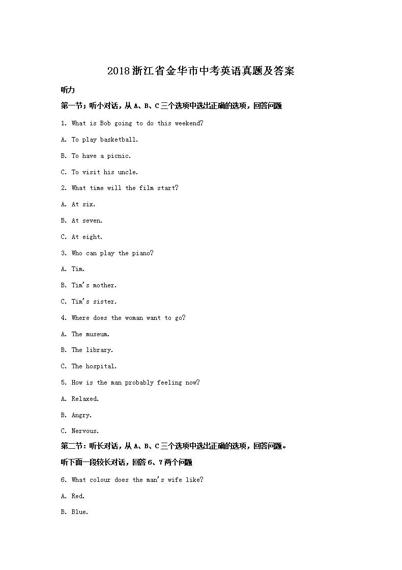 【文档名称】 2018浙江省金华市中考英语真题及答案(Word版).doc