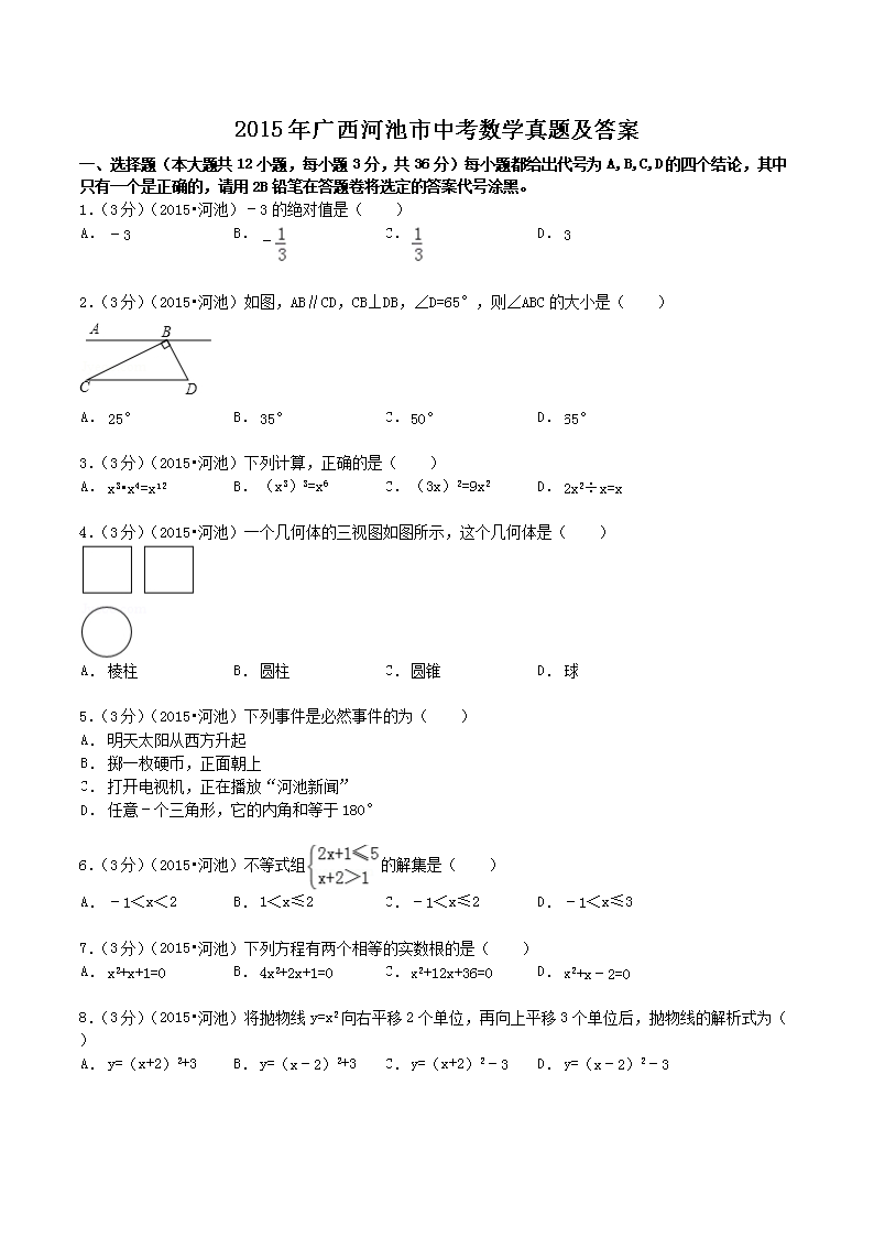 【文档名称】 2015年广西河池市中考数学真题及答案(Word版).doc