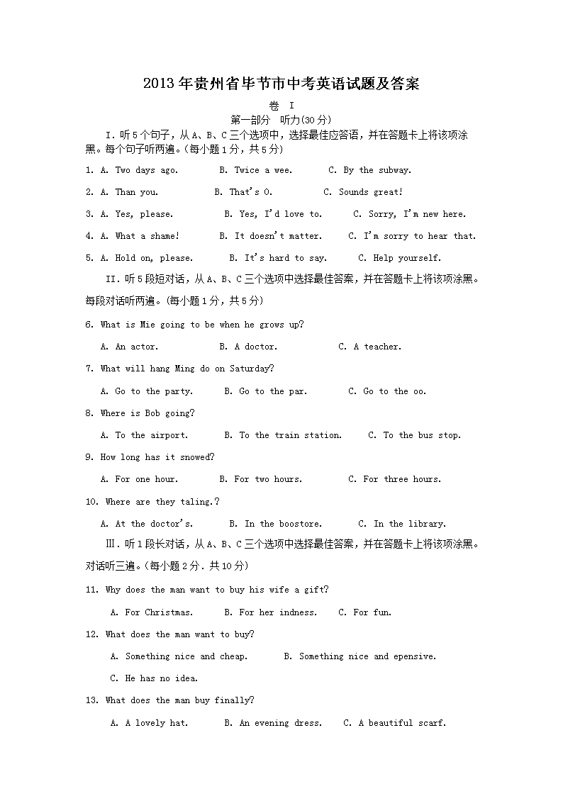 【文档名称】 2013年贵州省毕节市中考英语试题及答案(Word版).doc
