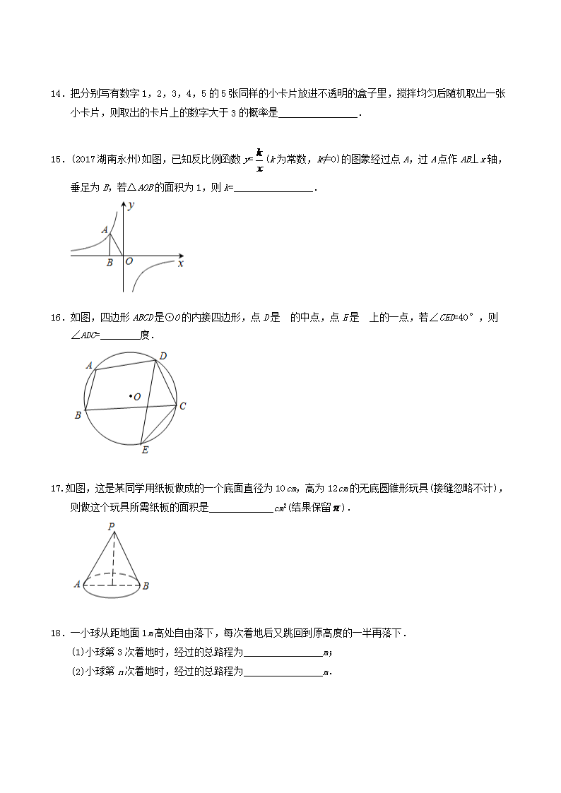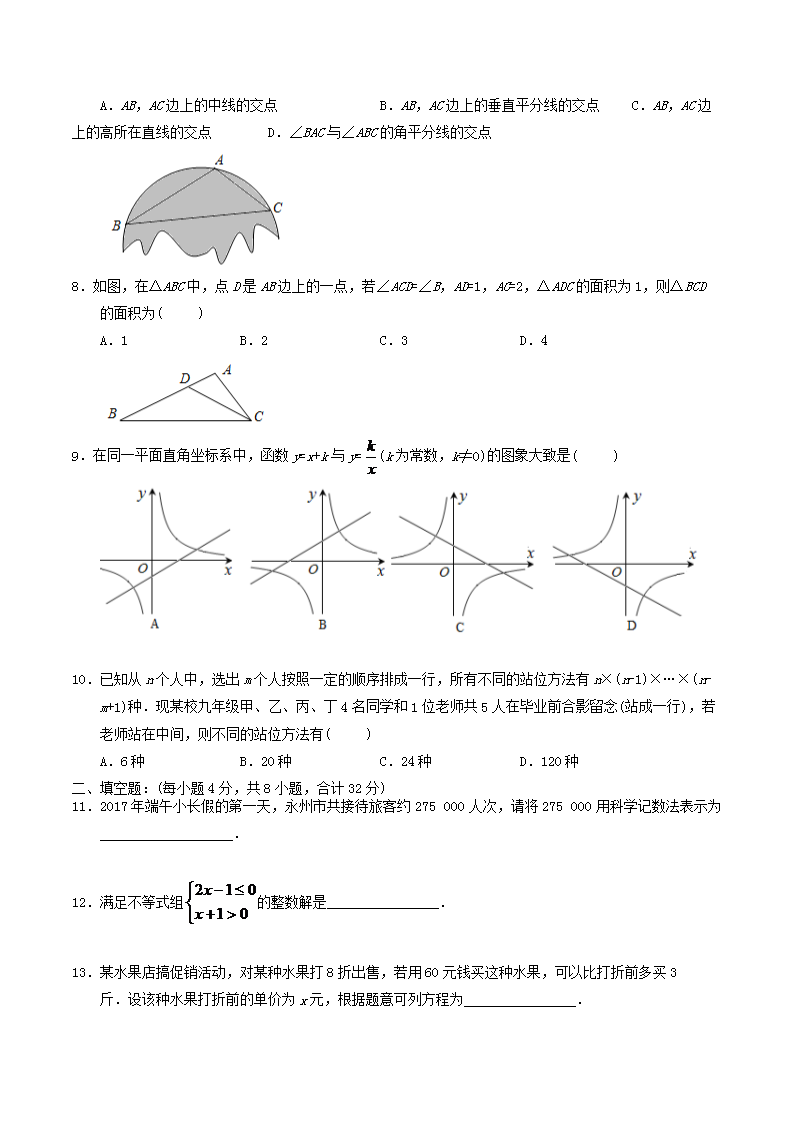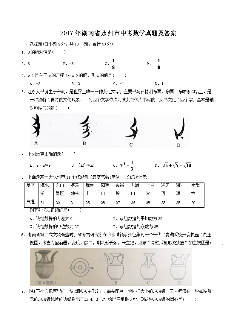 【文档名称】 2017年湖南省永州市中考数学真题及答案(Word版).doc