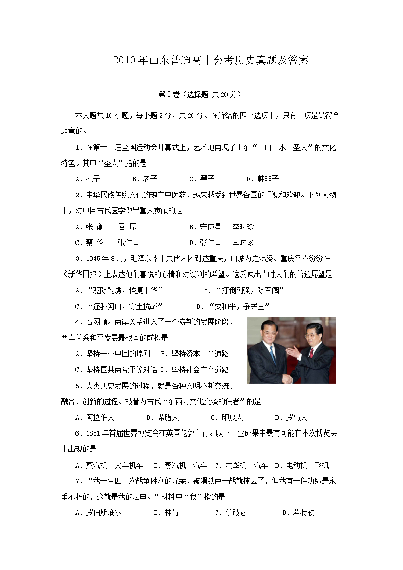 【文档名称】 2010年山东普通高中会考历史真题及答案(Word版).doc