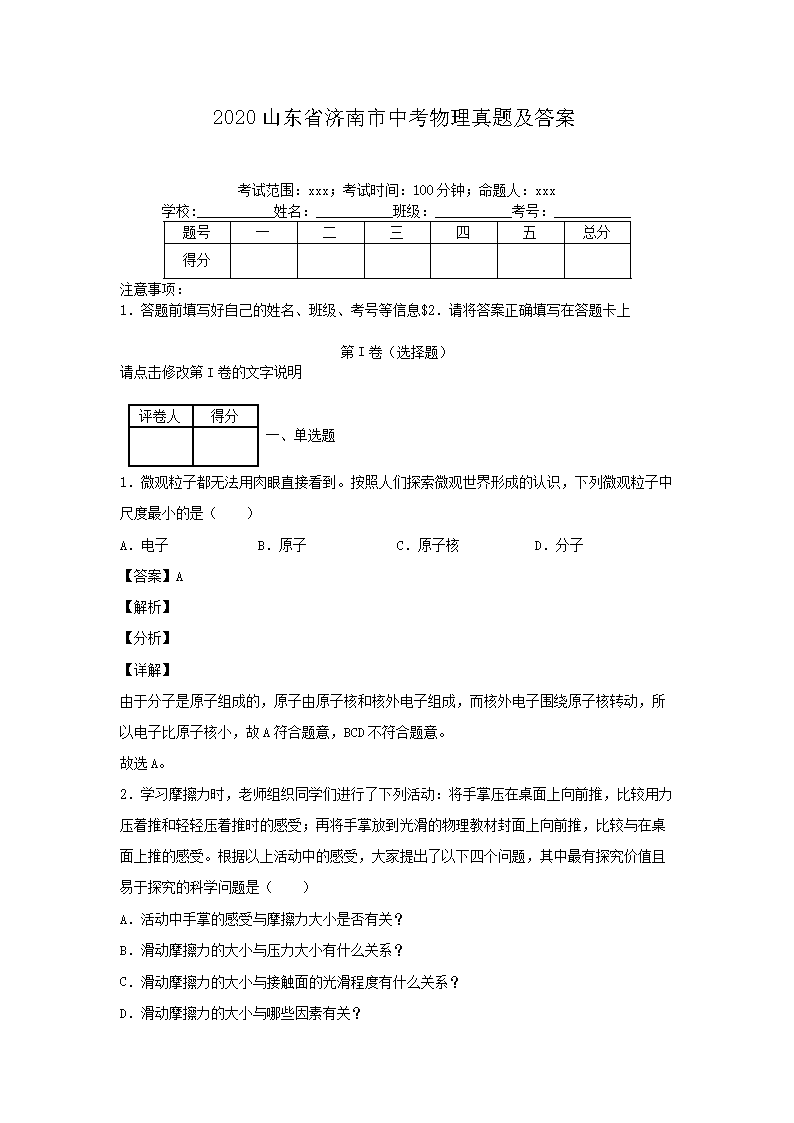 【文档名称】 2020山东省济南市中考物理真题及答案(Word版).doc