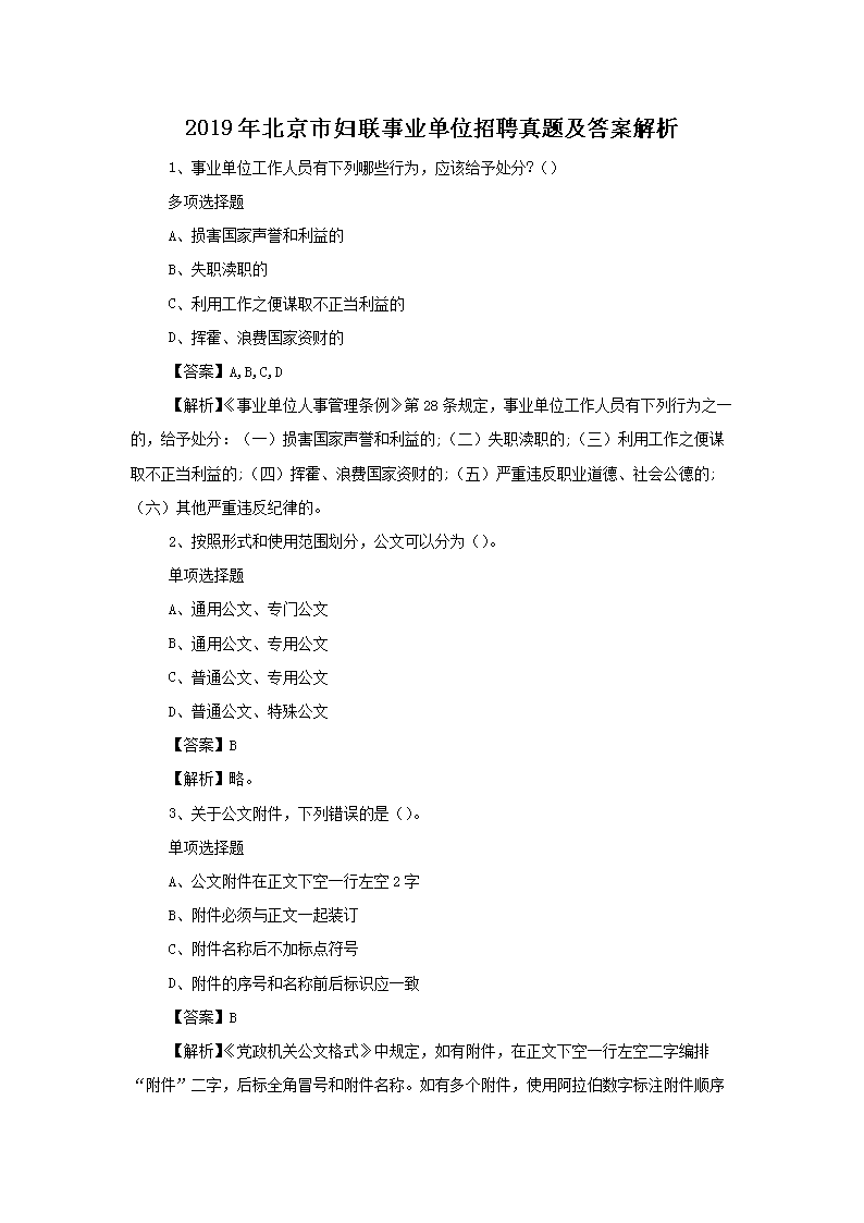 【文档名称】 2019年北京市妇联事业单位招聘真题及答案解析(Word版).doc