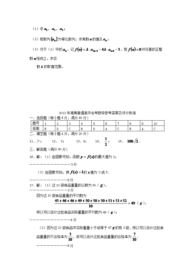 【文档名称】 2012年湖南普通高中会考数学真题及答案(Word版).doc