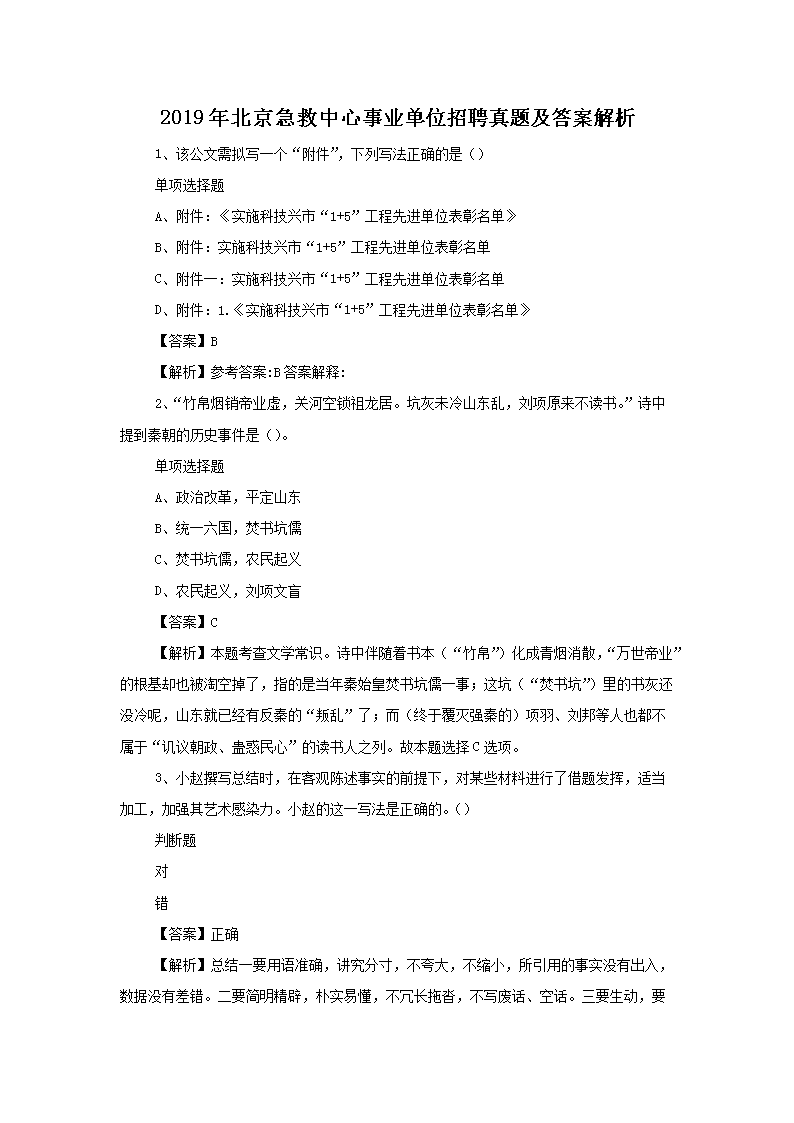 【文档名称】 2019年北京急救中心事业单位招聘真题及答案解析(Word版).doc