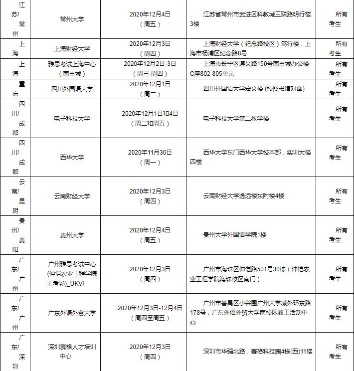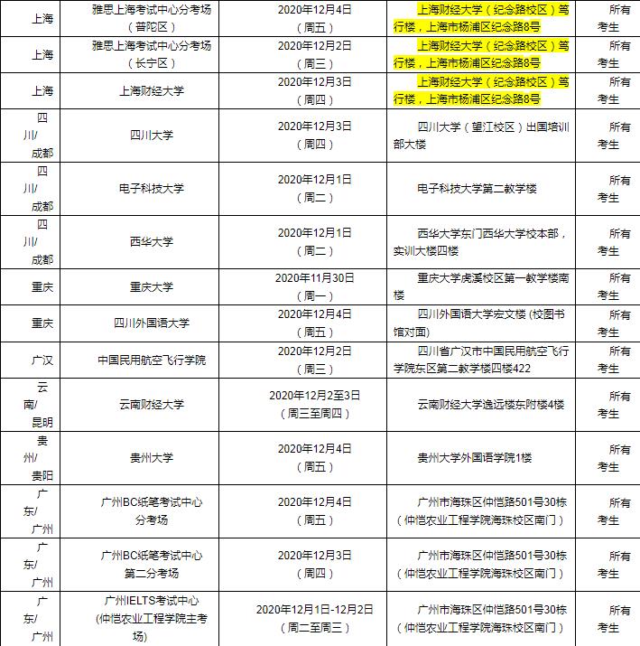 接英国文化教育协会通知,报考2020年12月5日雅思考试的考生口语安排如下,供广大考生参考。请按照报名网站公布的准考证打印时间登录雅思考试报名网站查询您的口试安排,打印准考证并以准考证信息为准。