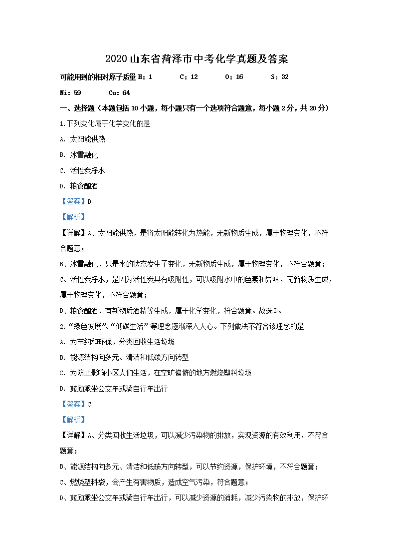 【文档名称】 2020山东省菏泽市中考化学真题及答案(Word版).doc