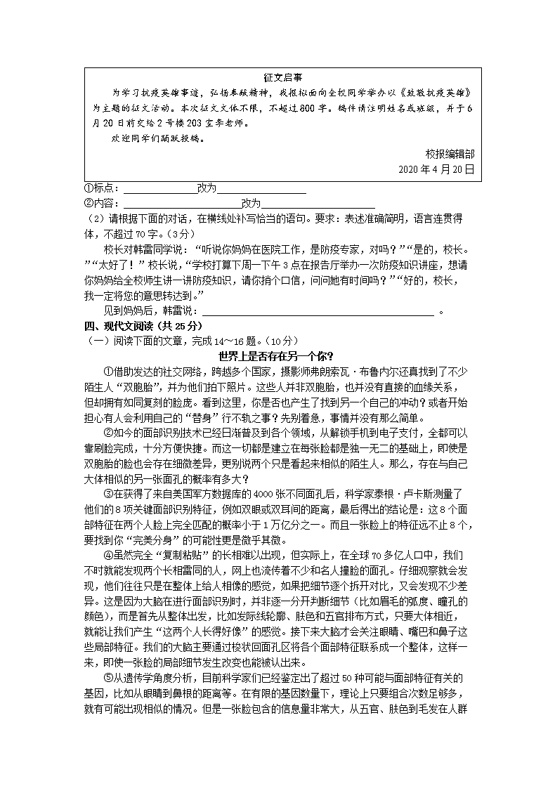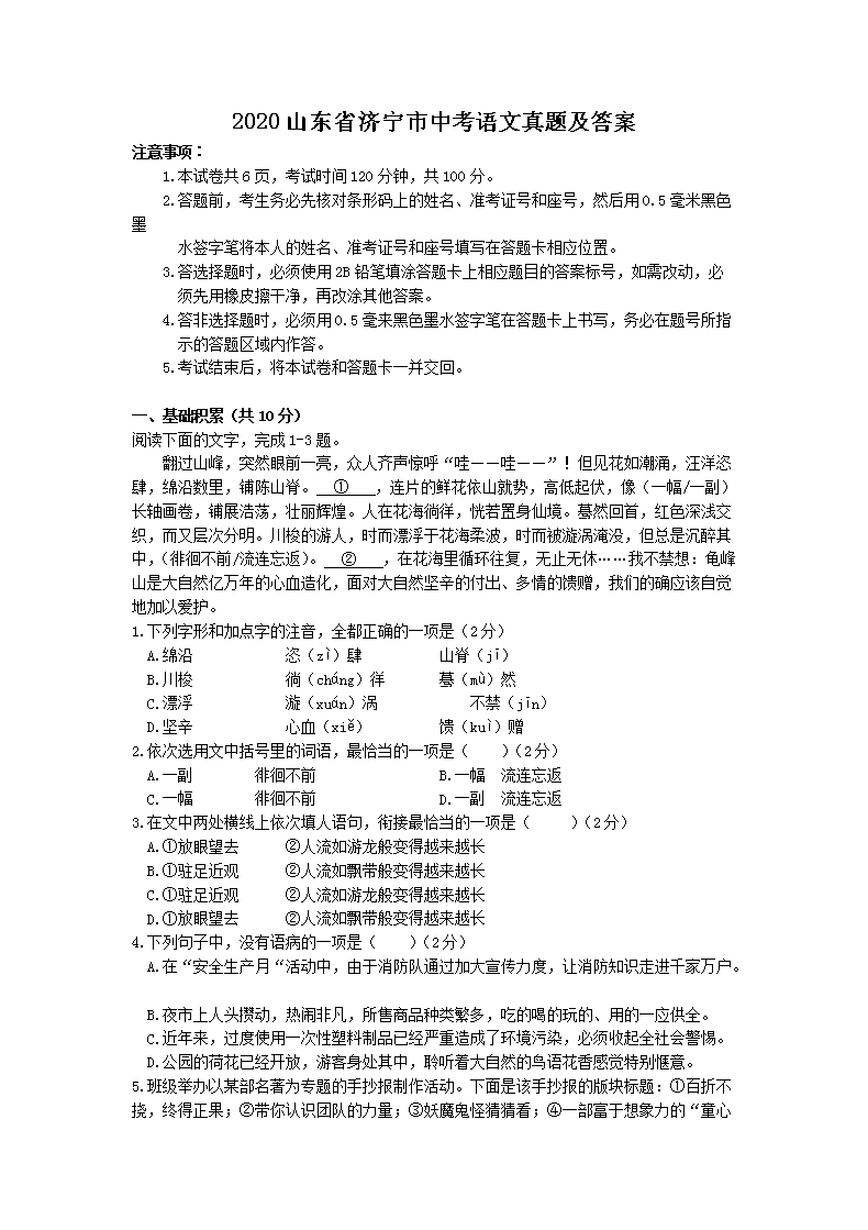 【文档名称】 2020山东省济宁市中考语文真题及答案(Word版).doc