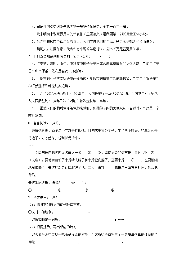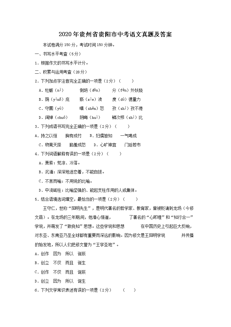 【文档名称】 2020年贵州省贵阳市中考语文真题及答案(Word版).doc