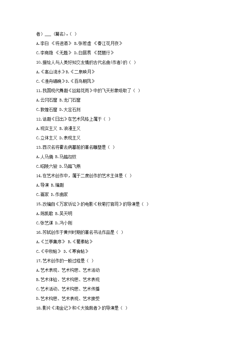 【文档名称】 2019年上海成人高考专升本艺术概论真题及答案(Word版).doc