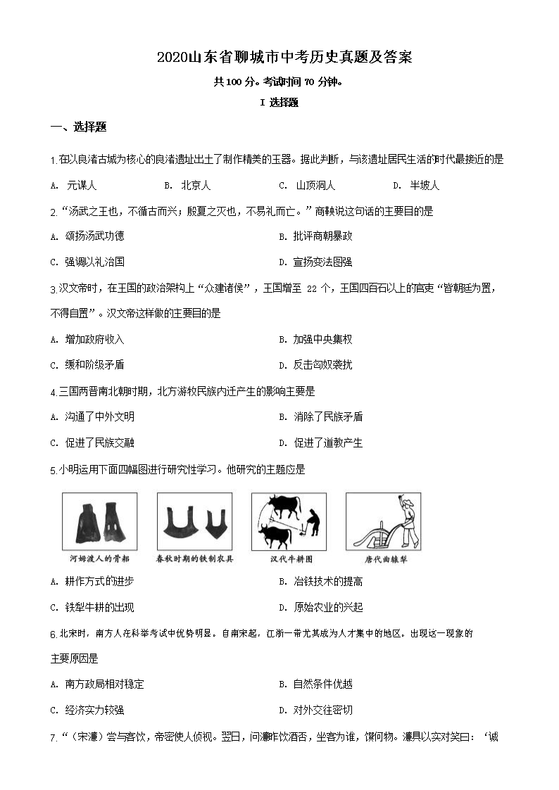 【文档名称】 2020山东省聊城市中考历史真题及答案(Word版).doc