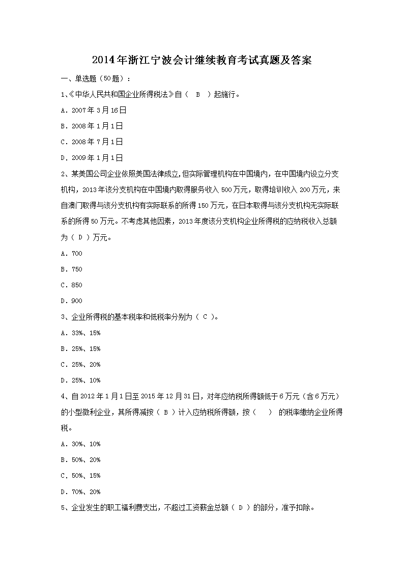 【文档预览】 无忧考网整理发布2014年浙江宁波会计继续教育考试真题及答案(Word版),前五页预览如下: