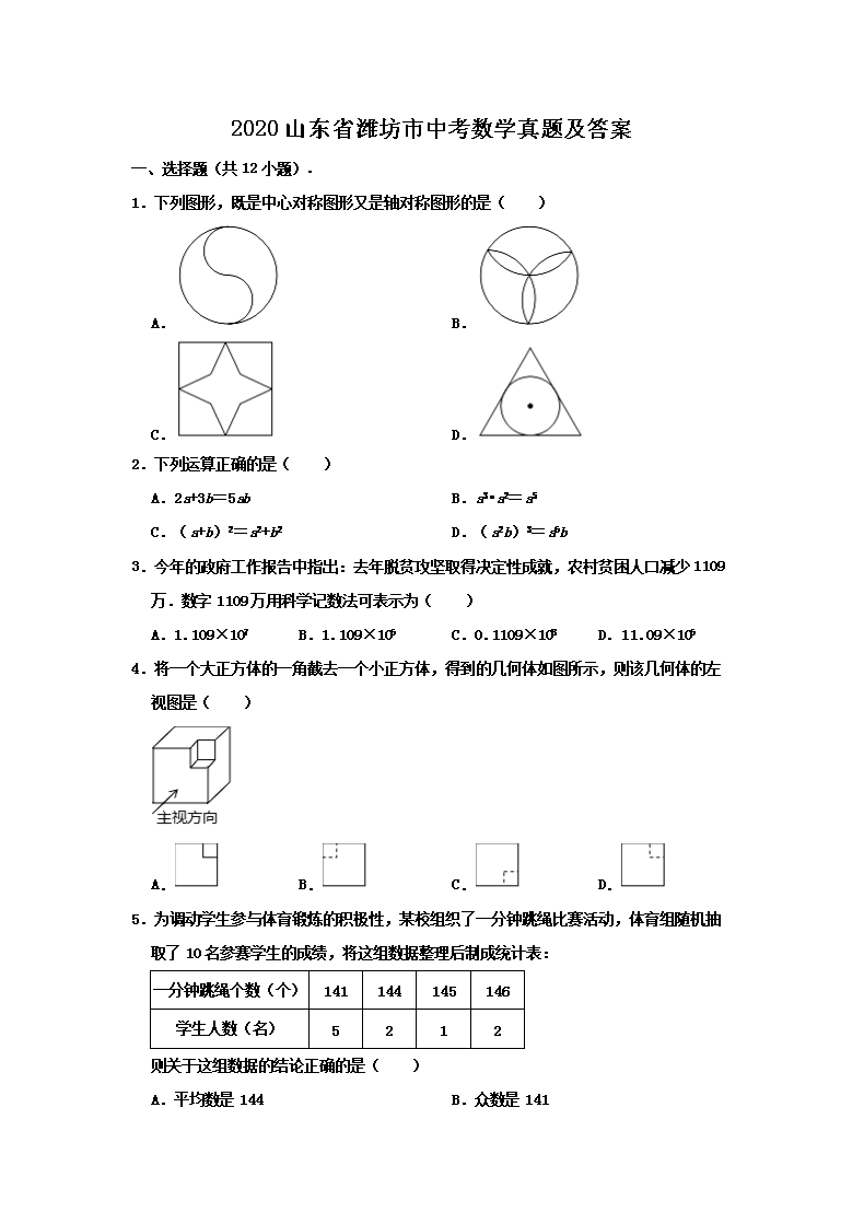 【文档名称】 2020山东省潍坊市中考数学真题及答案(Word版).doc