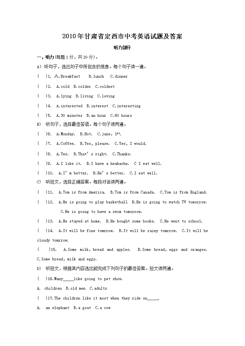 【文档名称】 2010年甘肃省定西市中考英语试题及答案(Word版).doc