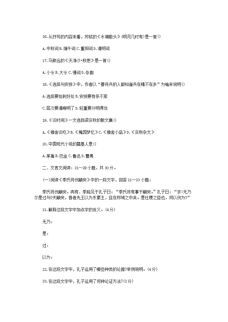 【文档名称】 2017年吉林成人高考专升本大学语文真题及答案(Word版).doc