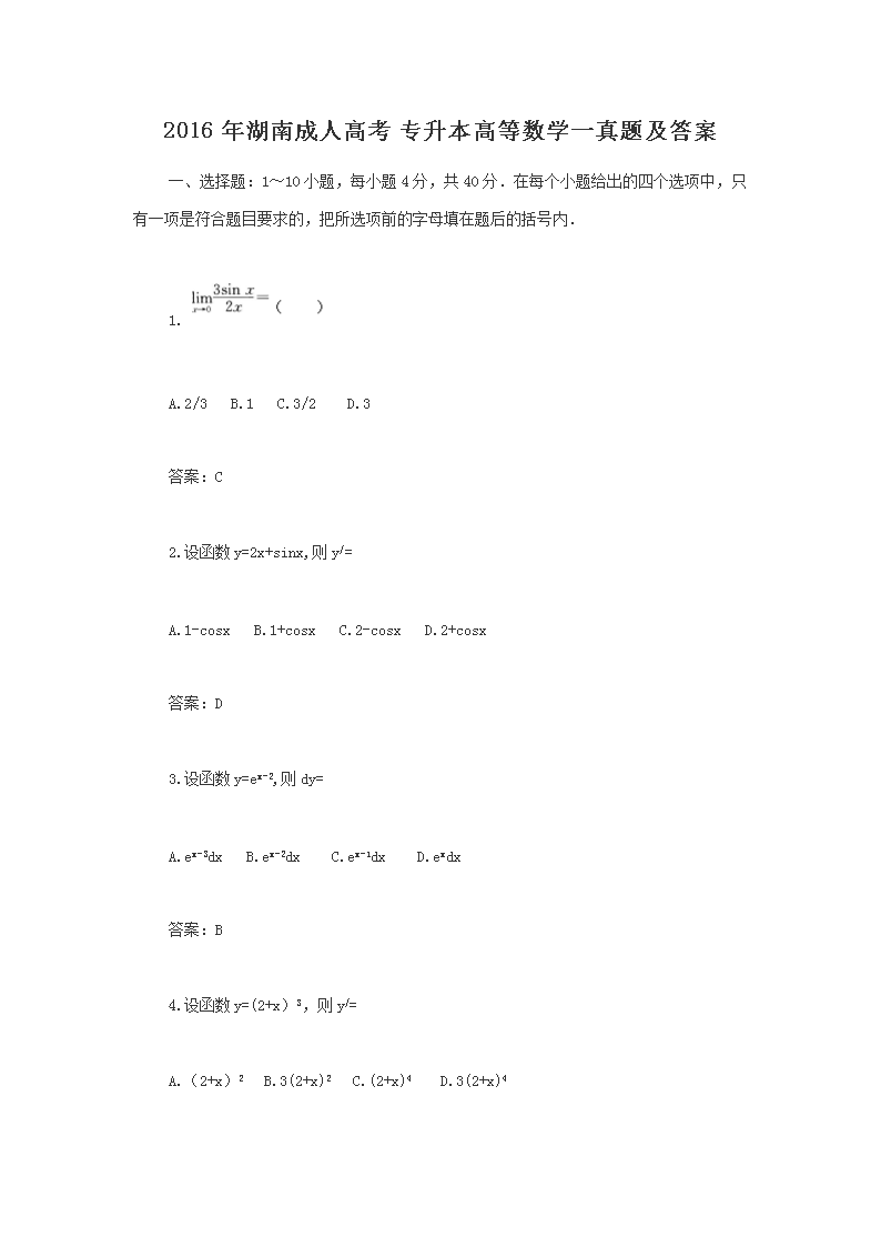 【文档名称】 2016年湖南成人高考专升本高等数学一真题及答案(Word版).doc