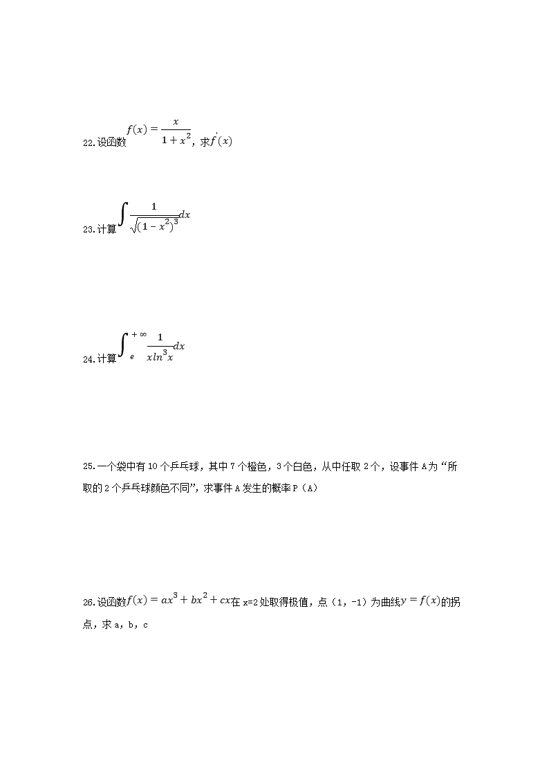 【文档名称】 2019年湖南成人高考专升本高等数学二真题及答案(Word版).doc