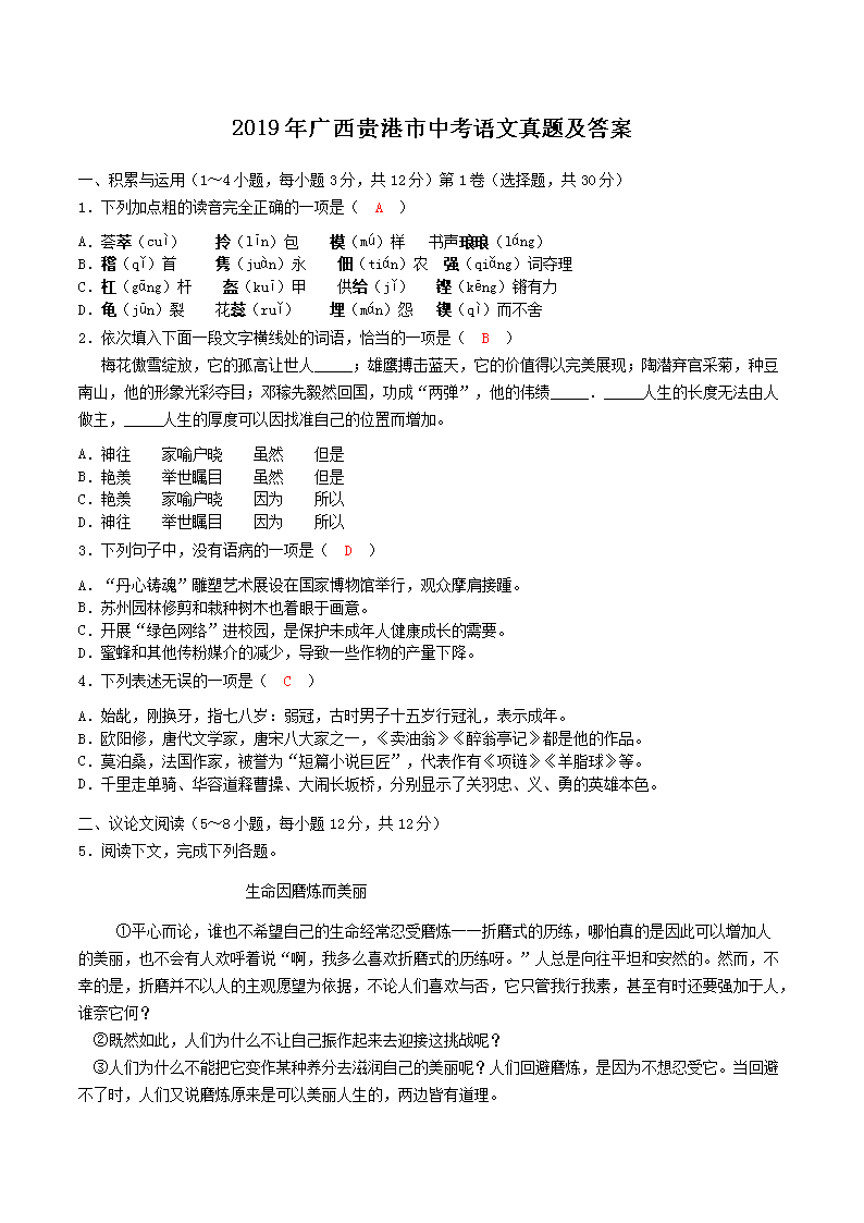 【文档名称】 2019年广西贵港市中考语文真题及答案(Word版).doc