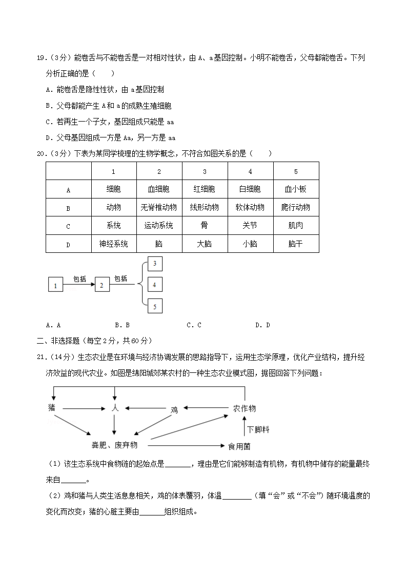 【文档名称】 2019年四川省绵阳市中考生物真题及答案(Word版).doc