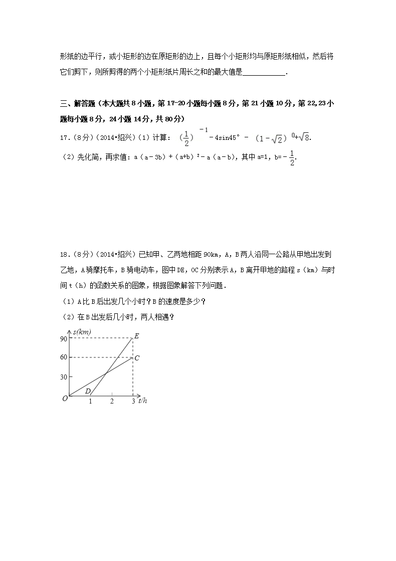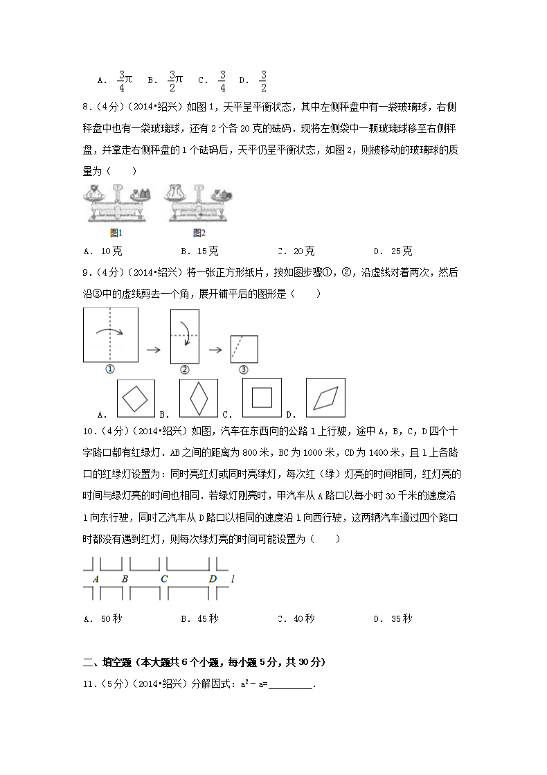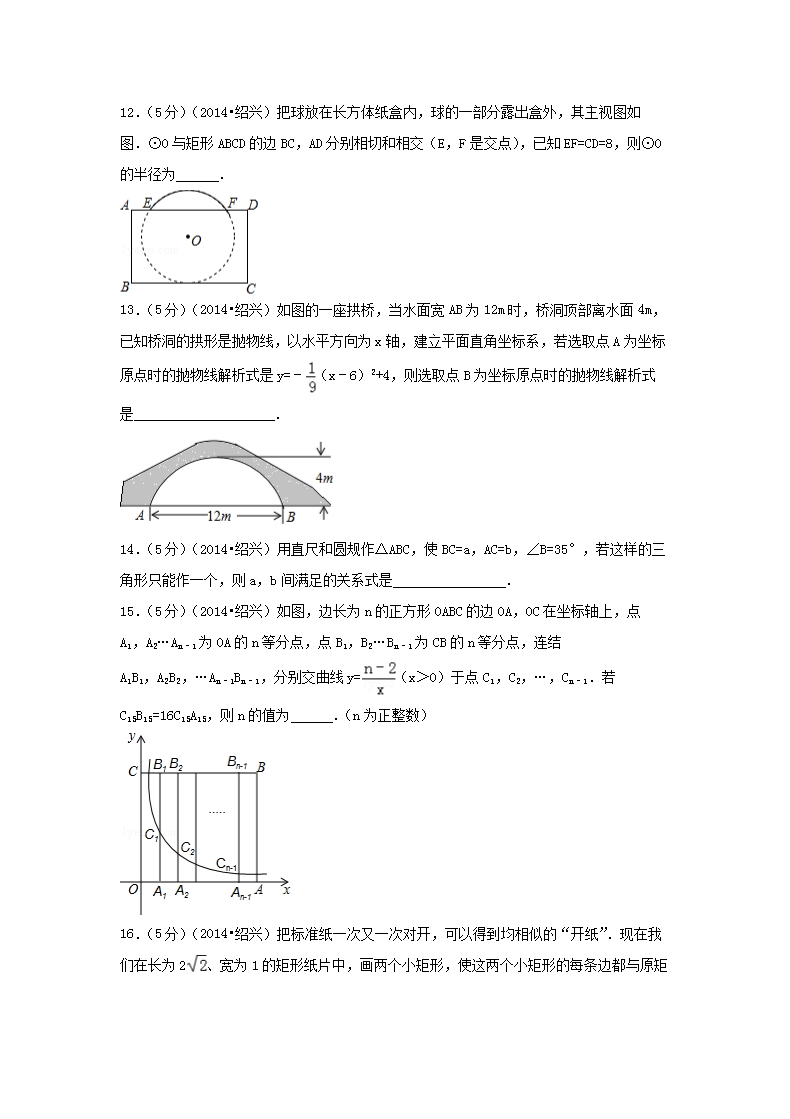 【文档名称】 2014浙江省绍兴市中考数学真题及答案(Word版).doc