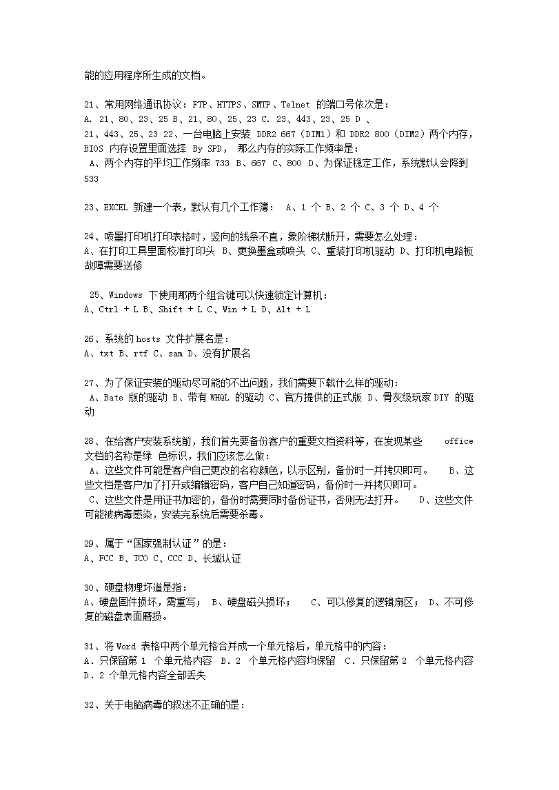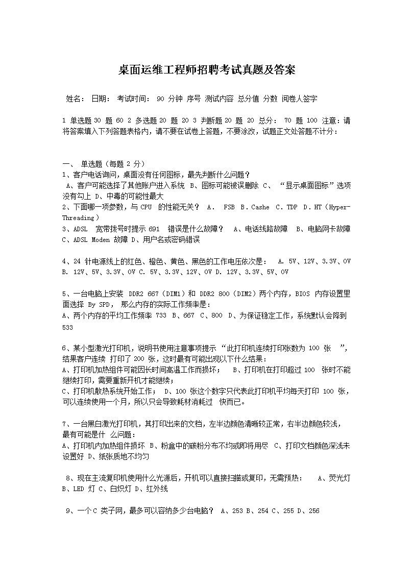 【文档名称】 桌面运维工程师招聘考试真题及答案(Word版).doc