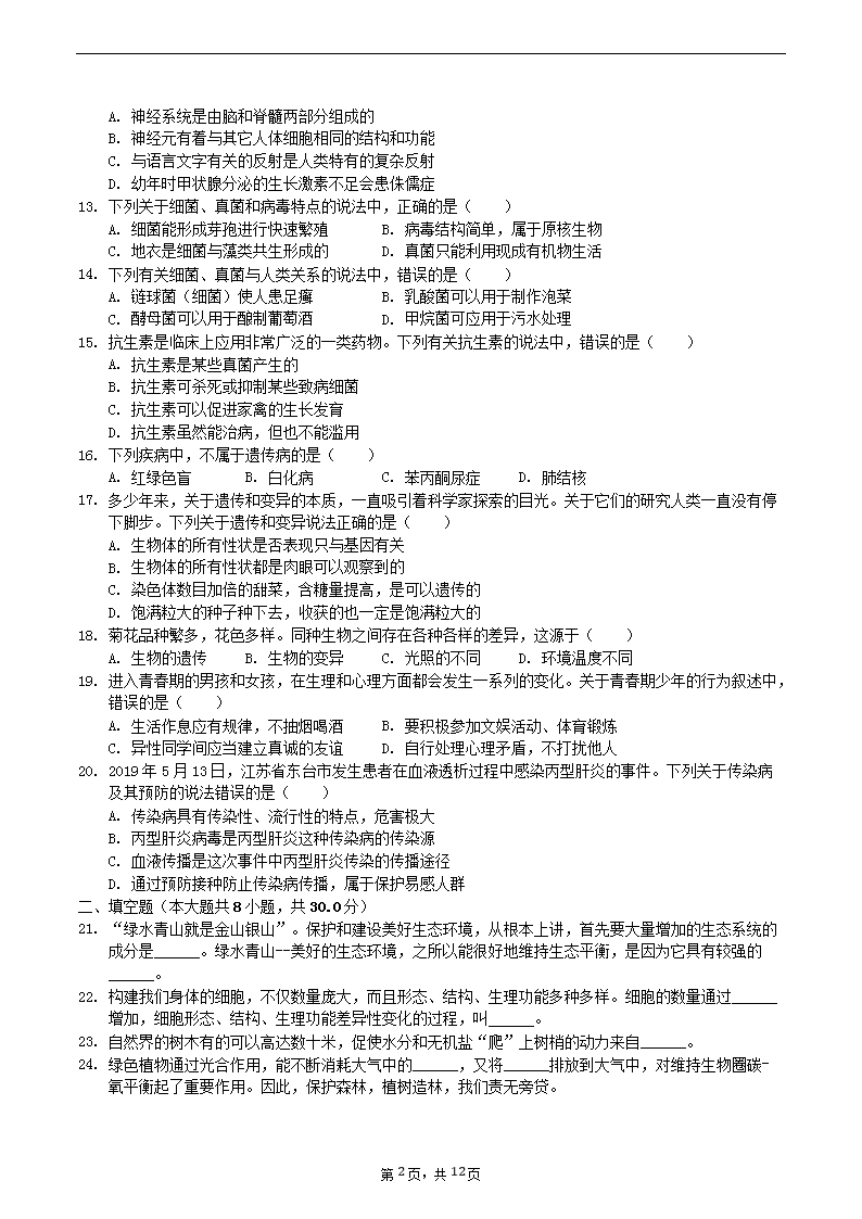 【文档名称】 2019年四川省乐山市中考生物真题及答案(Word版).doc