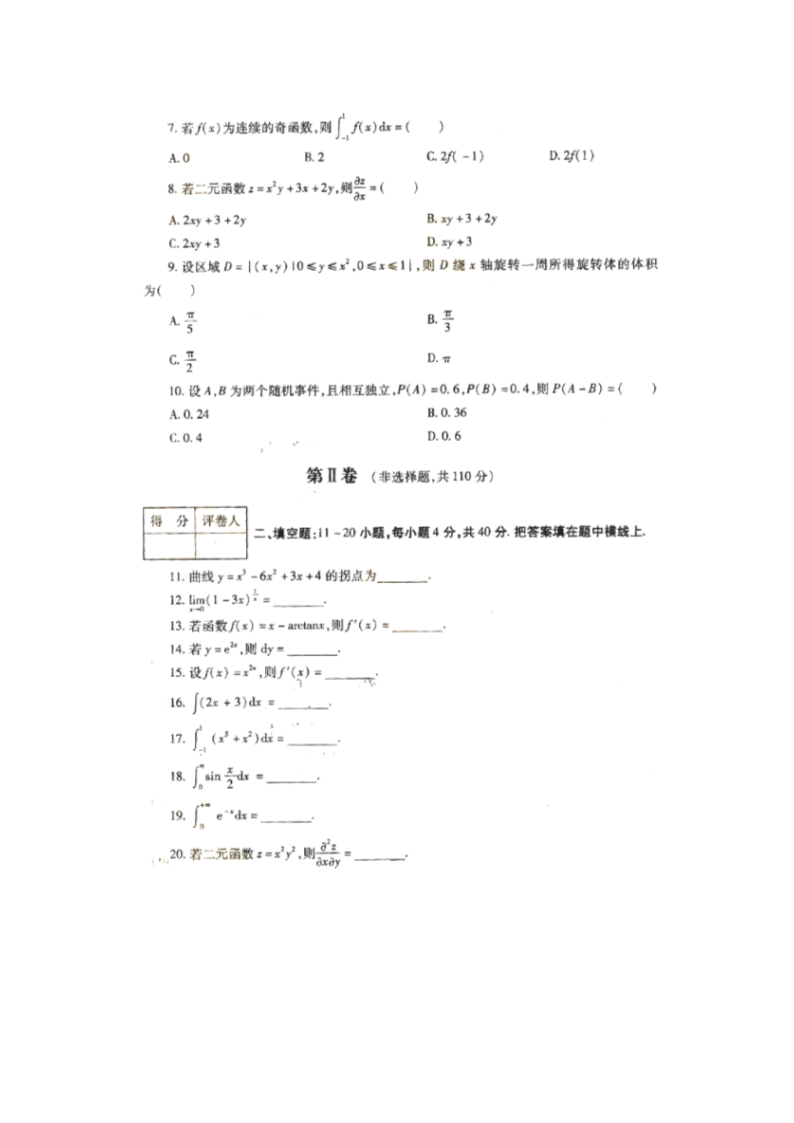 【文档名称】 2018年海南成人高考专升本高等数学二真题及答案(Word版).doc