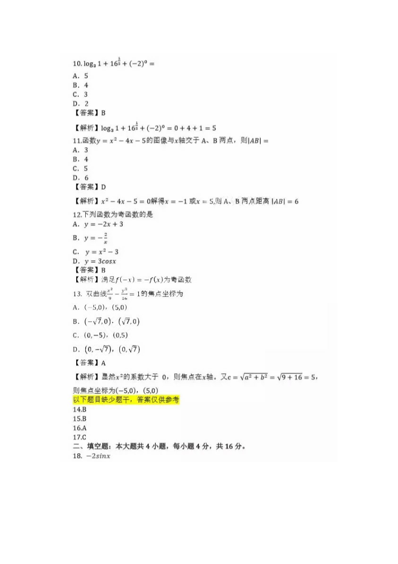 【文档名称】 2019年海南成人高考高起点数学(文)真题及答案(Word版).doc