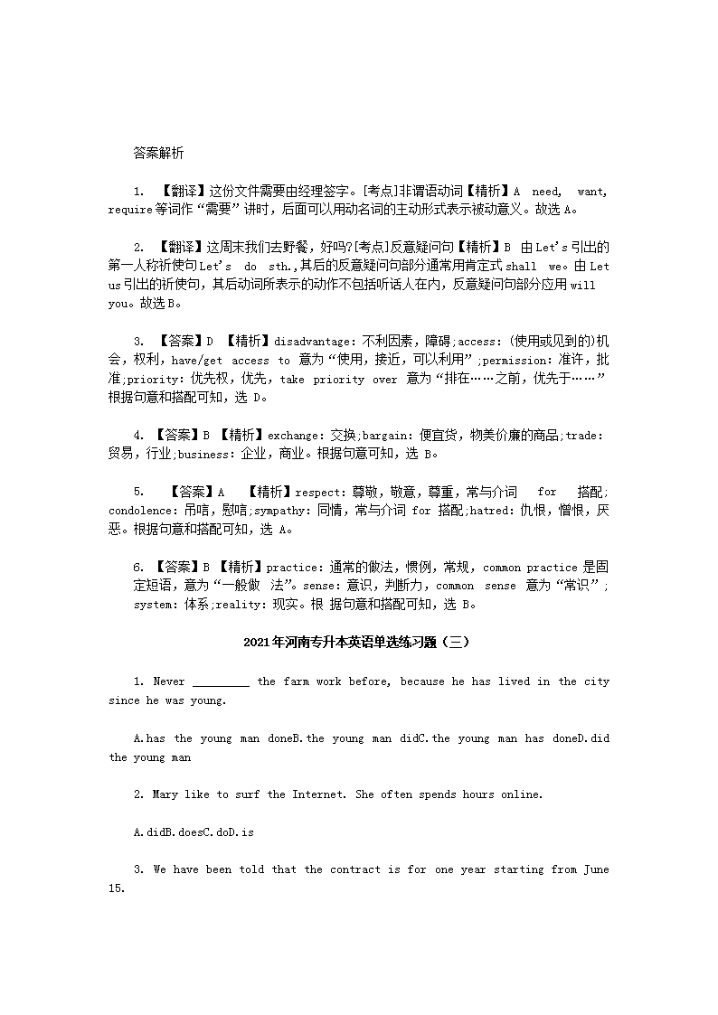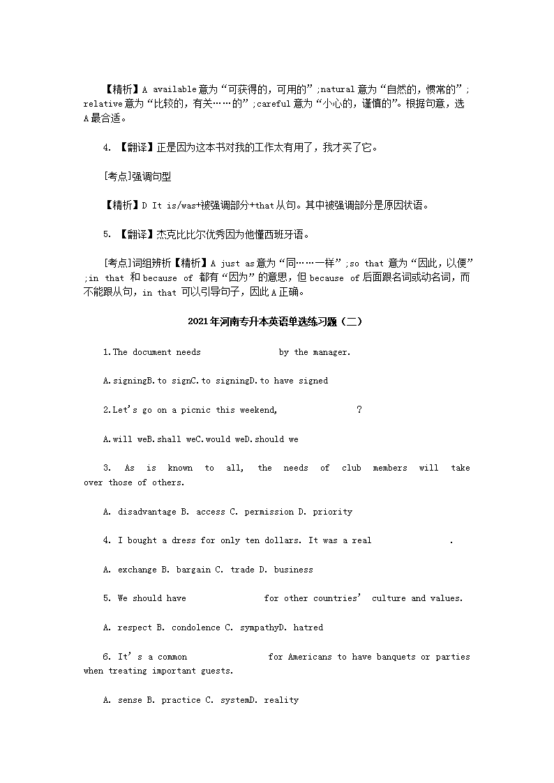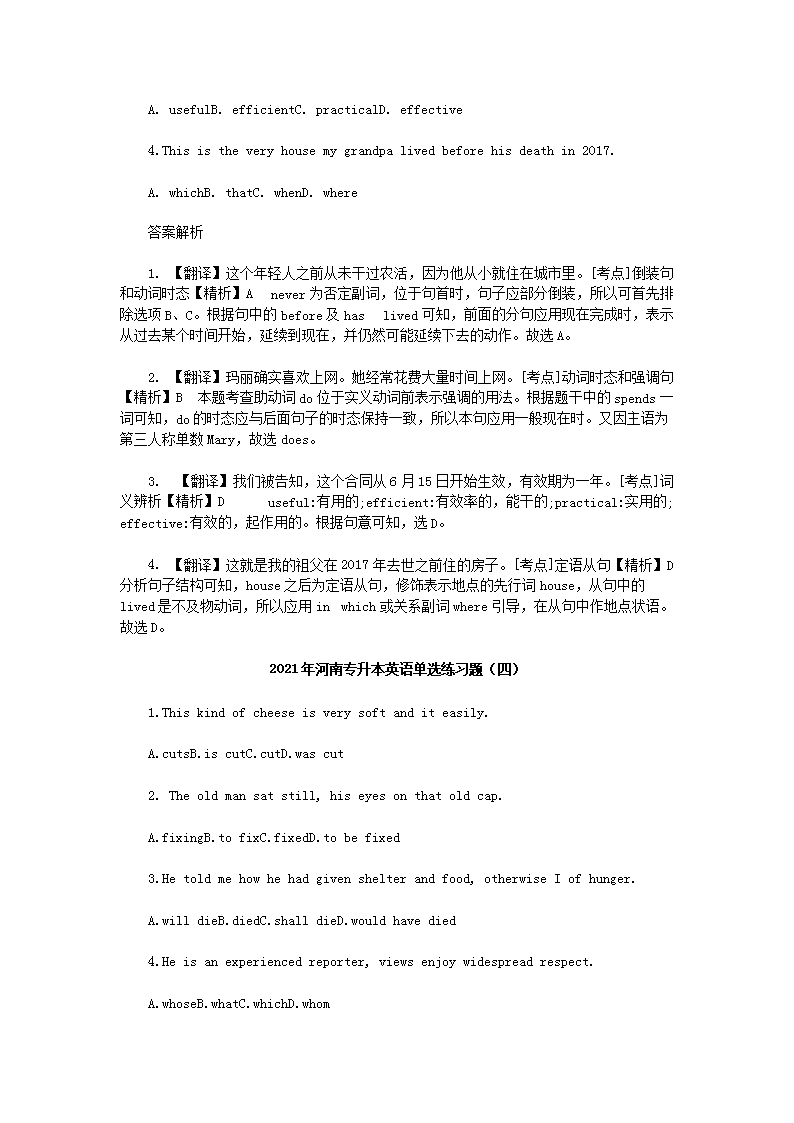 【文档名称】 2021年河南专升本英语单选练习题四套(Word版).doc
