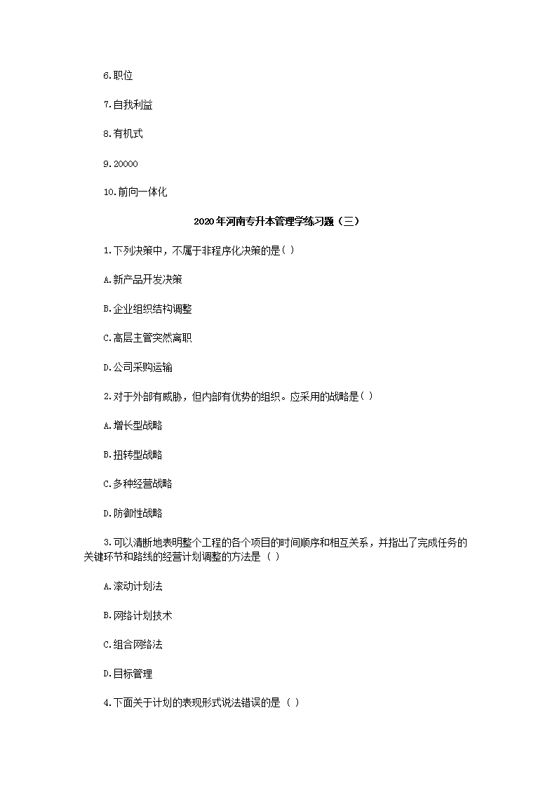 【文档预览】 无忧考网整理发布2020年河南专升本管理学练习题三套(Word版),前五页预览如下:
