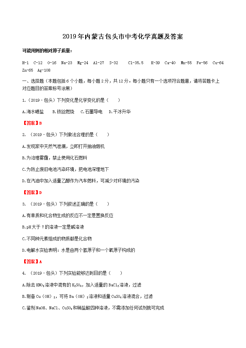 【文档名称】 2019年内蒙古包头市中考化学真题及答案(Word版).doc