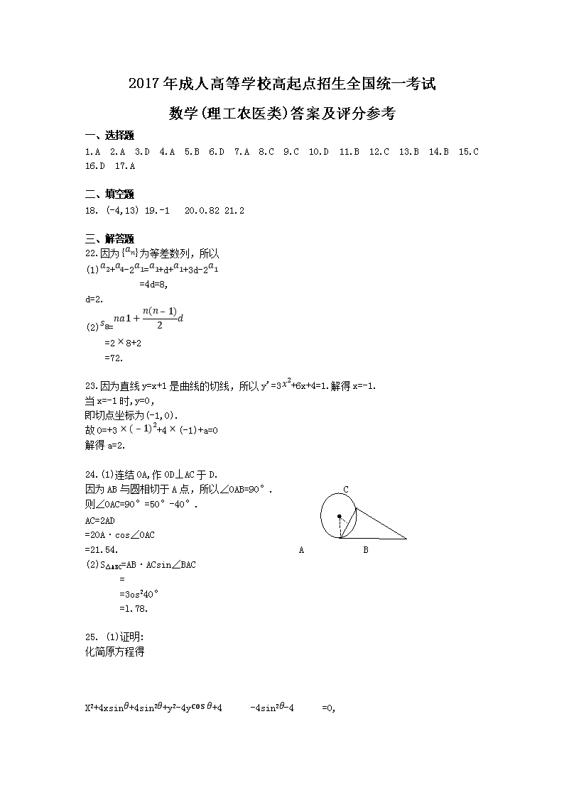 【文档名称】 2017年贵州成人高考高起点数学(文)真题及答案(Word版).doc