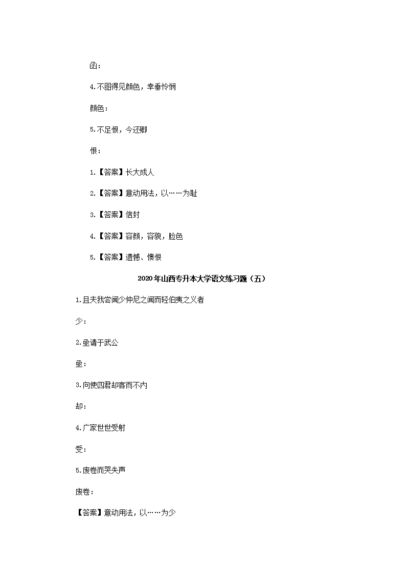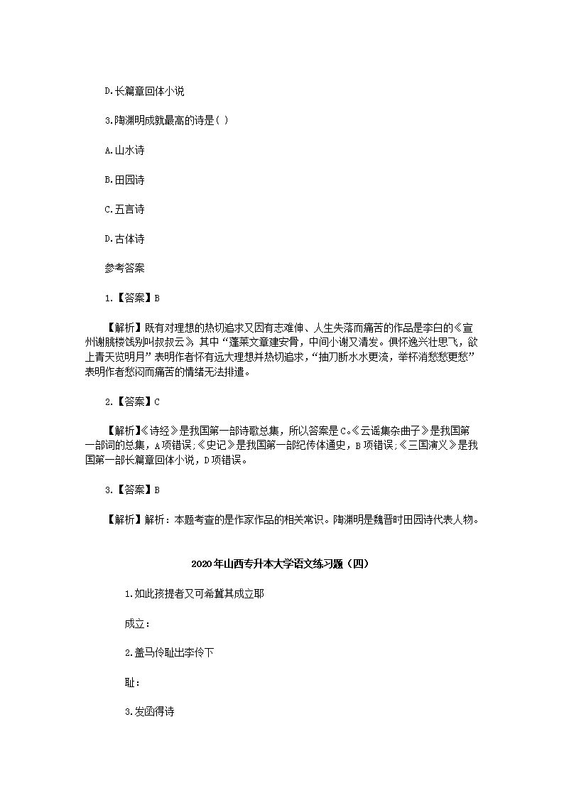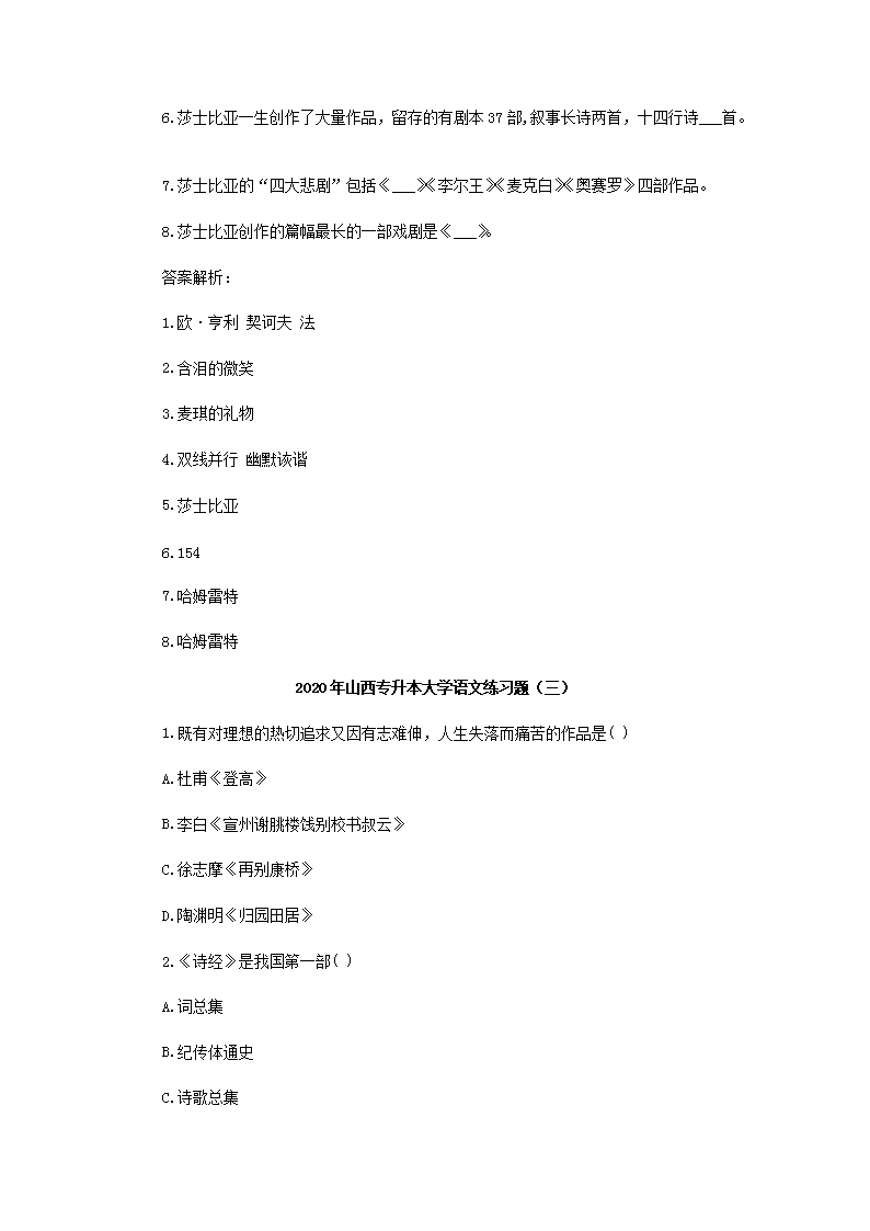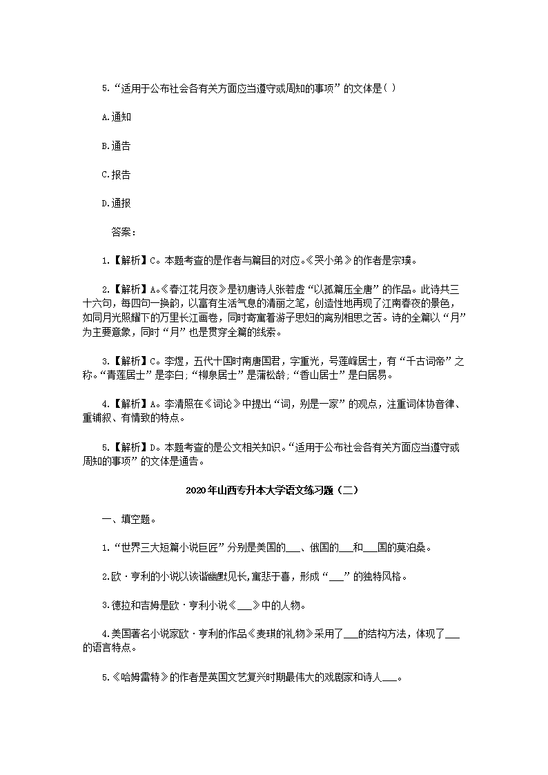 【文档名称】 2020年山西专升本大学语文练习题五套(Word版).doc