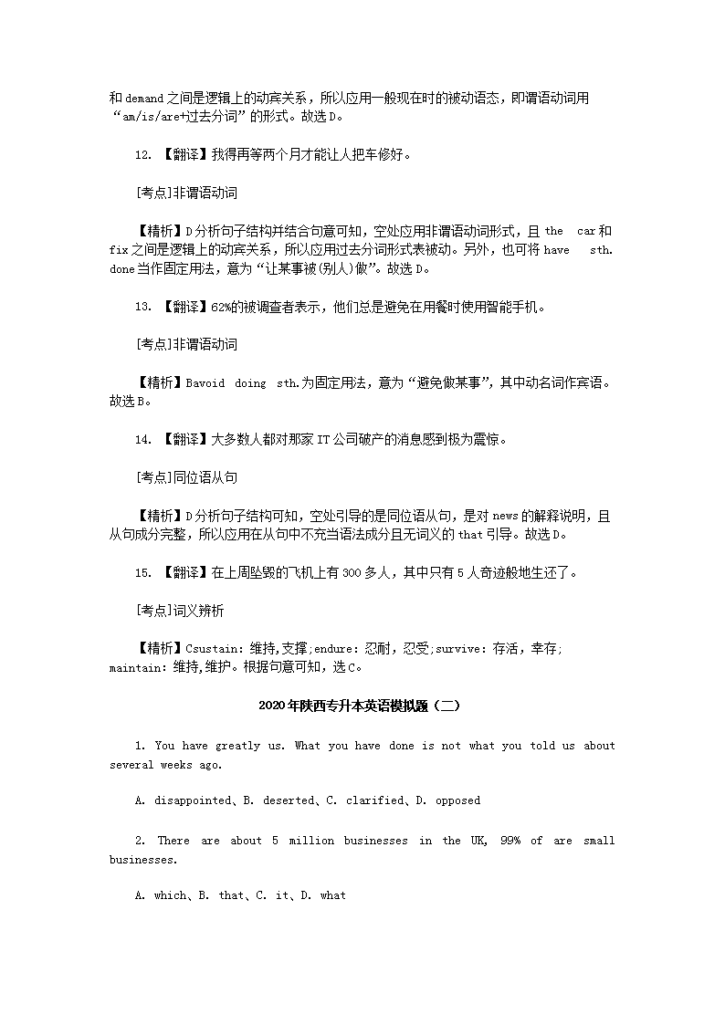 【文档预览】 无忧考网整理发布2020年陕西专升本英语模拟题三套(Word版),前五页预览如下: