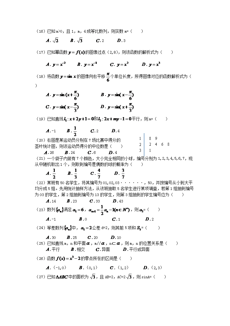 【文档名称】 2015年贵州普通高中会考数学考试真题(Word版).doc