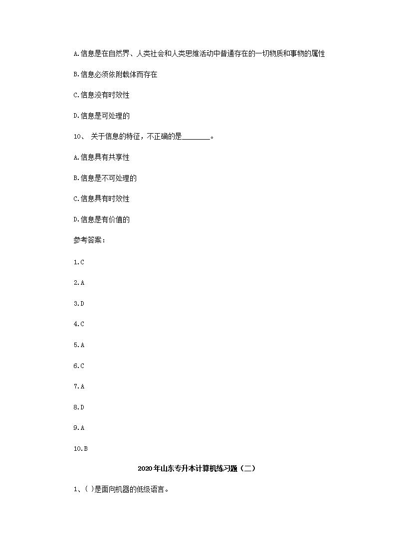 【文档名称】 2020年山东专升本计算机练习题三套(Word版).doc
