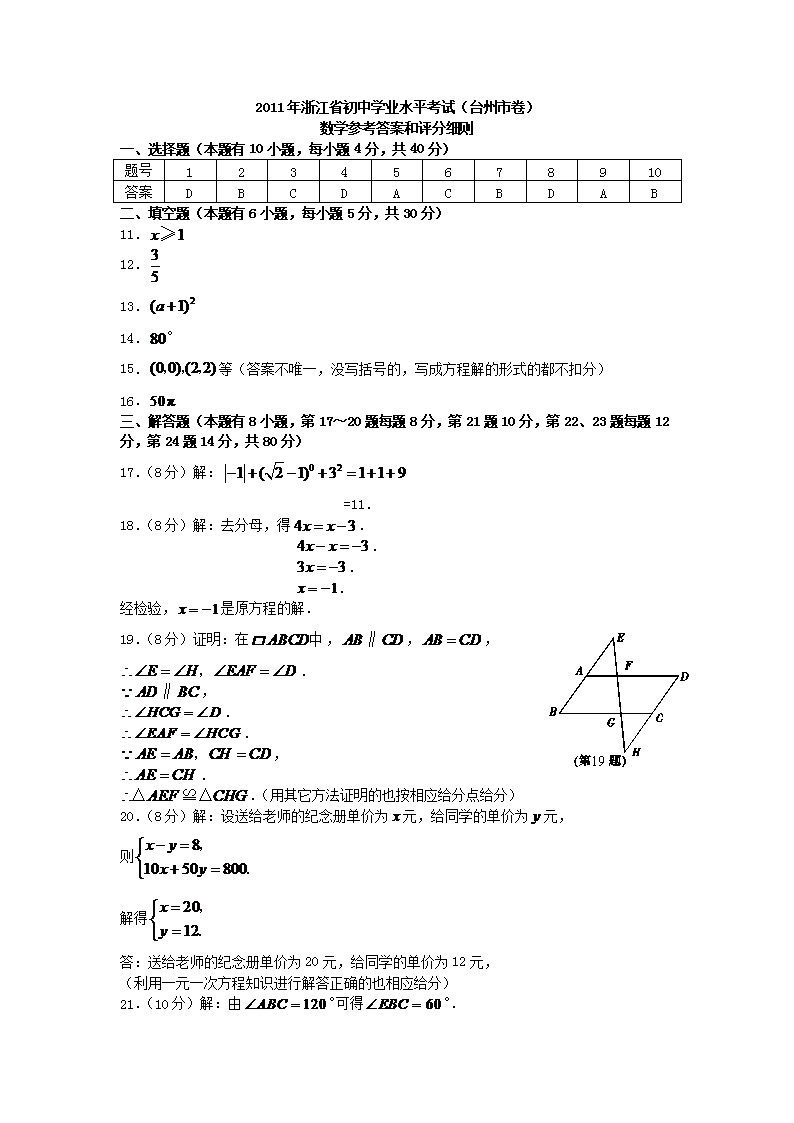 【文档名称】 2011浙江省台州市中考数学真题及答案(Word版).doc