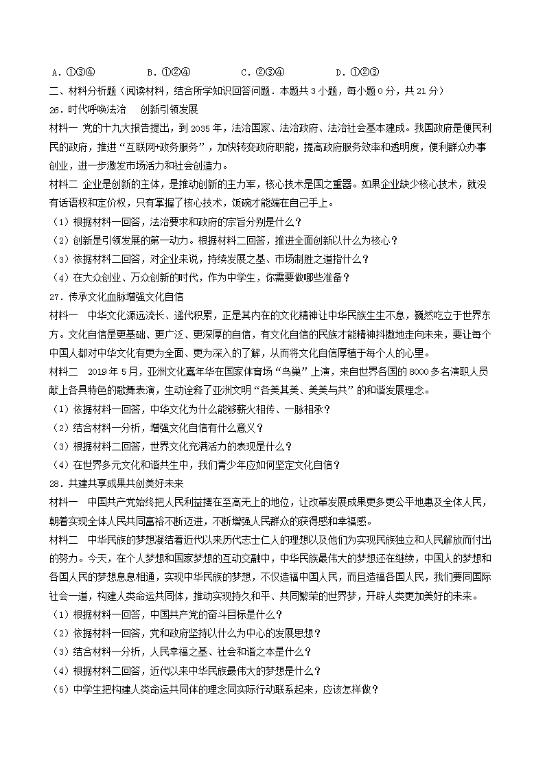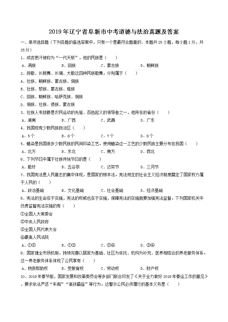【文档名称】 2019年辽宁省阜新市中考道德与法治真题及答案(Word版).doc