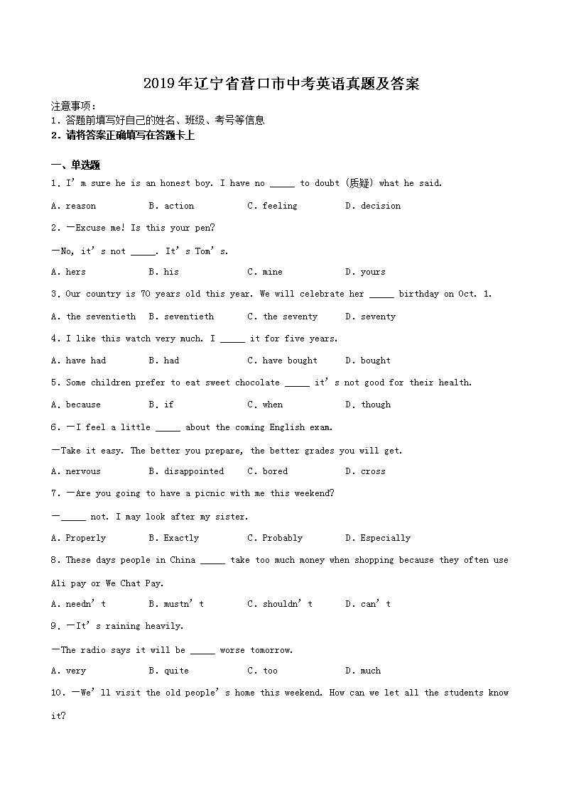 【文档名称】 2019年辽宁省营口市中考英语真题及答案(Word版).doc