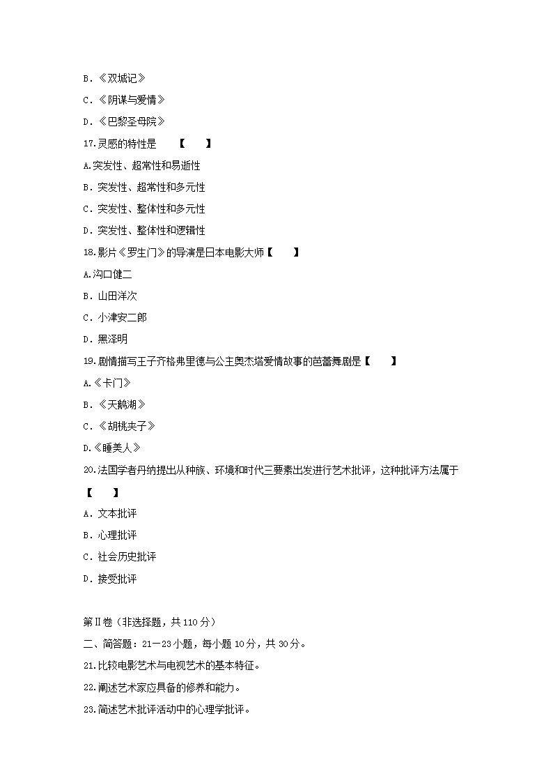 【文档名称】 2018年贵州成人高考专升本艺术概论真题及答案(Word版).doc