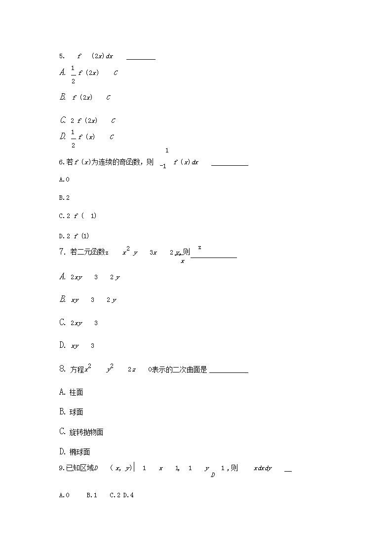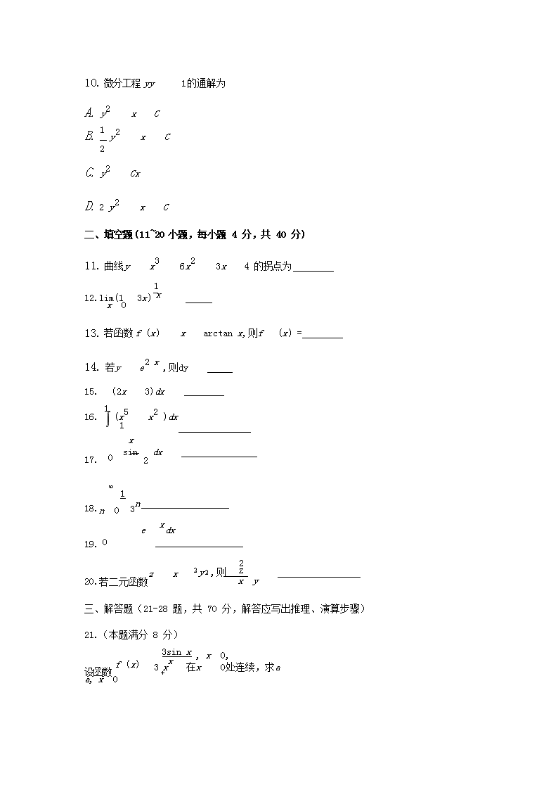 【文档名称】 2018年贵州成人高考专升本高等数学一真题及答案(Word版).doc