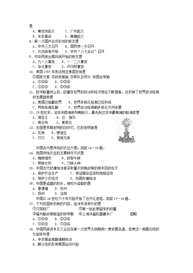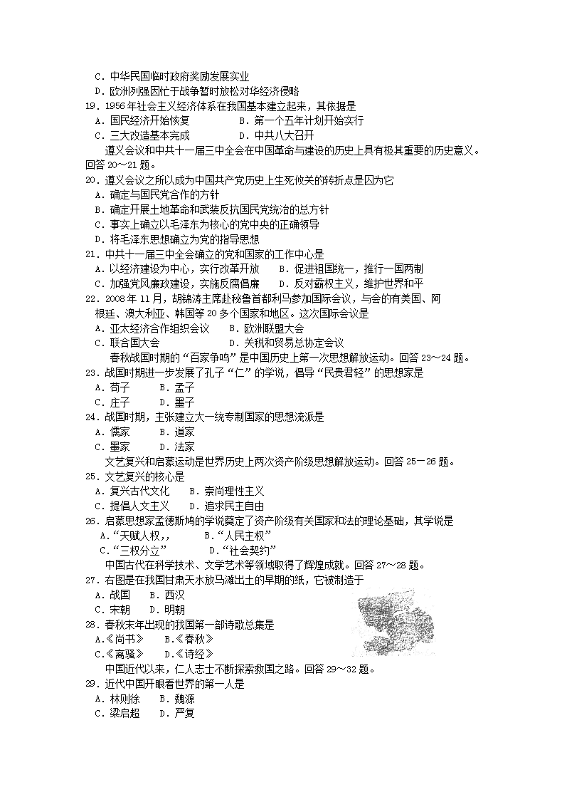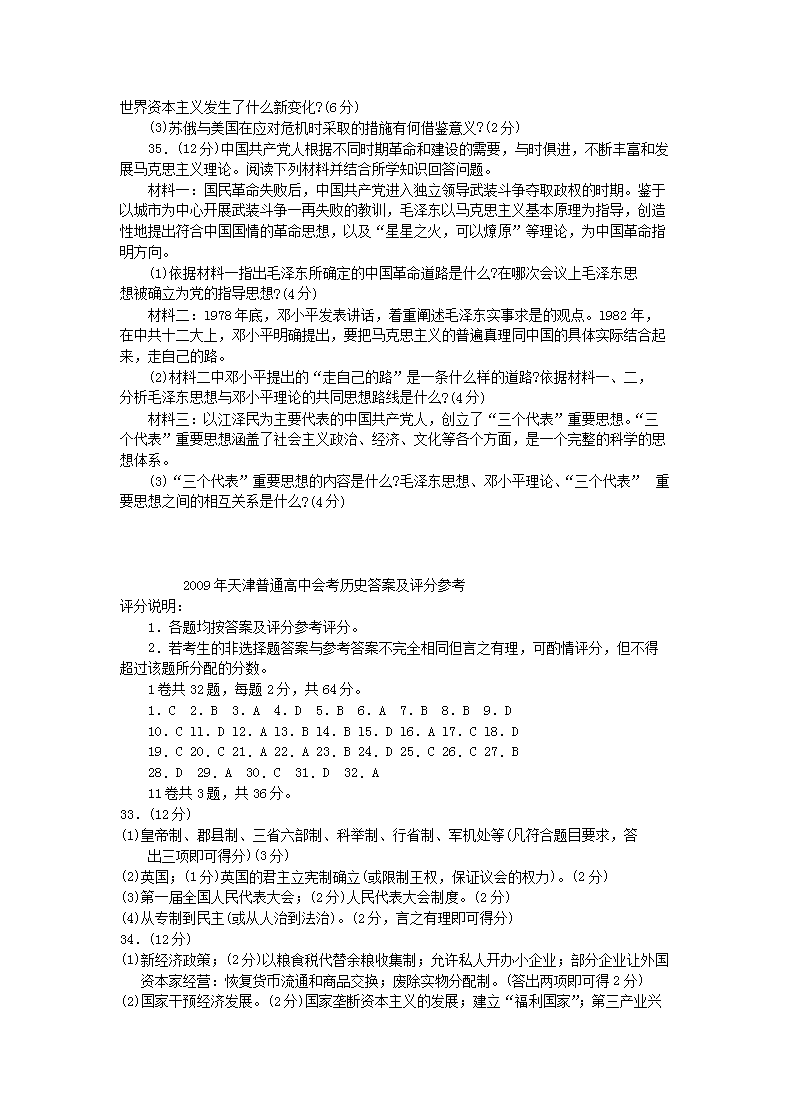 【文档名称】 2009年天津普通高中会考历史真题及答案(Word版).doc