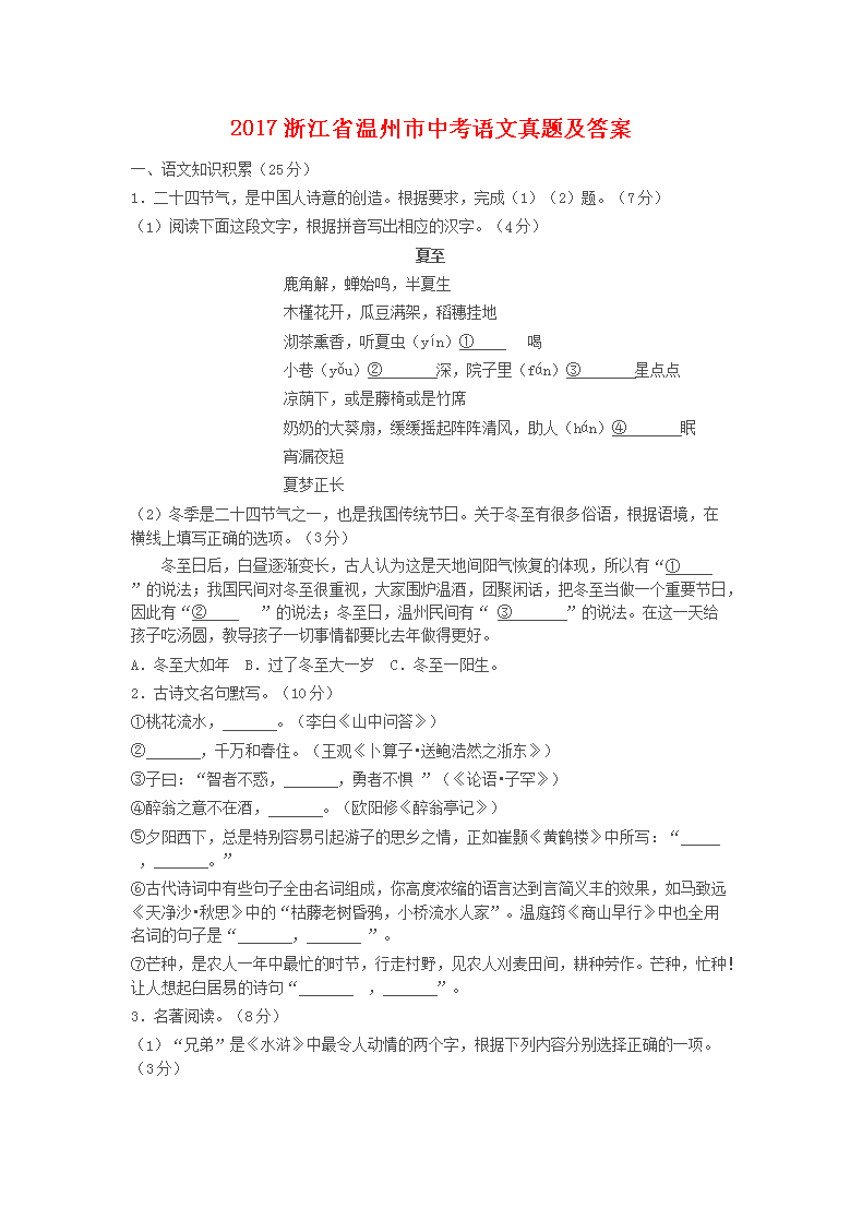 【文档名称】 2017浙江省温州市中考语文真题及答案(Word版).doc