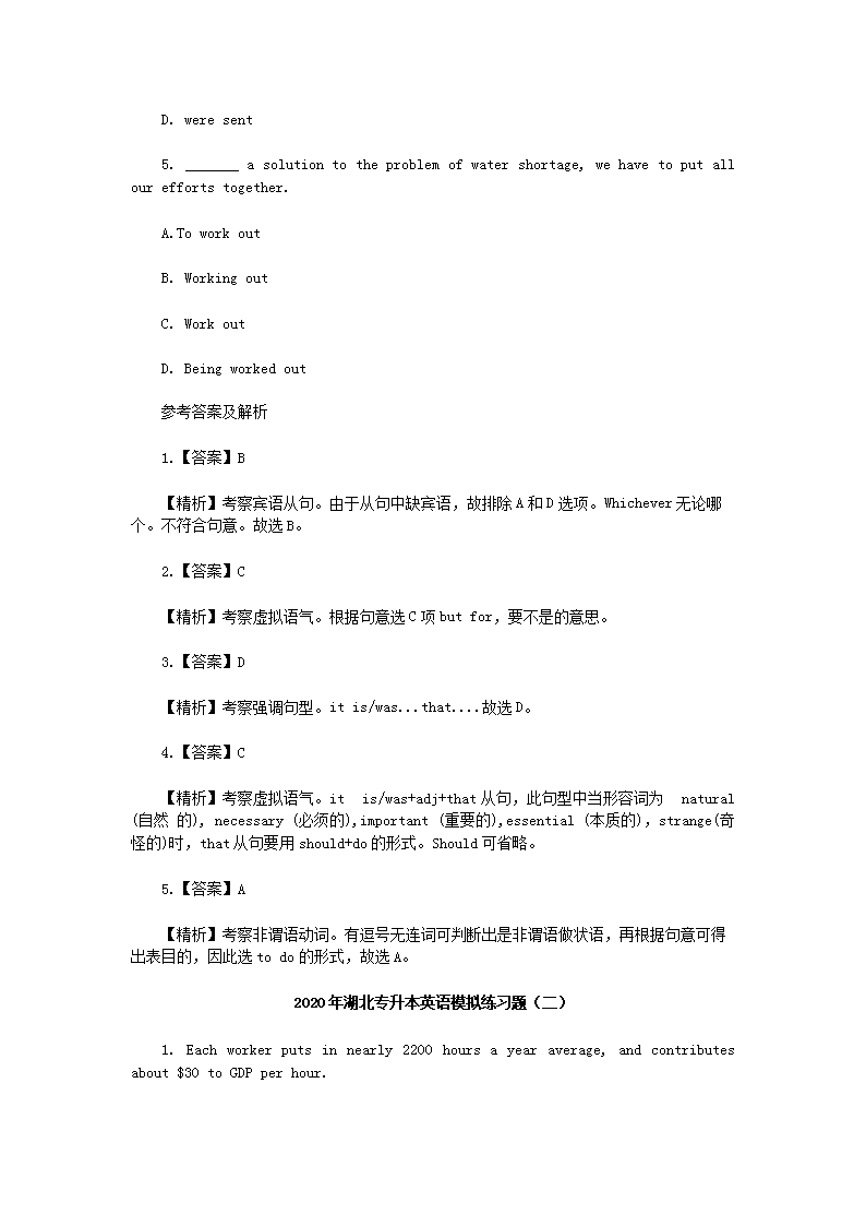 【文档预览】 无忧考网整理发布2020年湖北专升本英语模拟练习题三套(Word版),前五页预览如下: