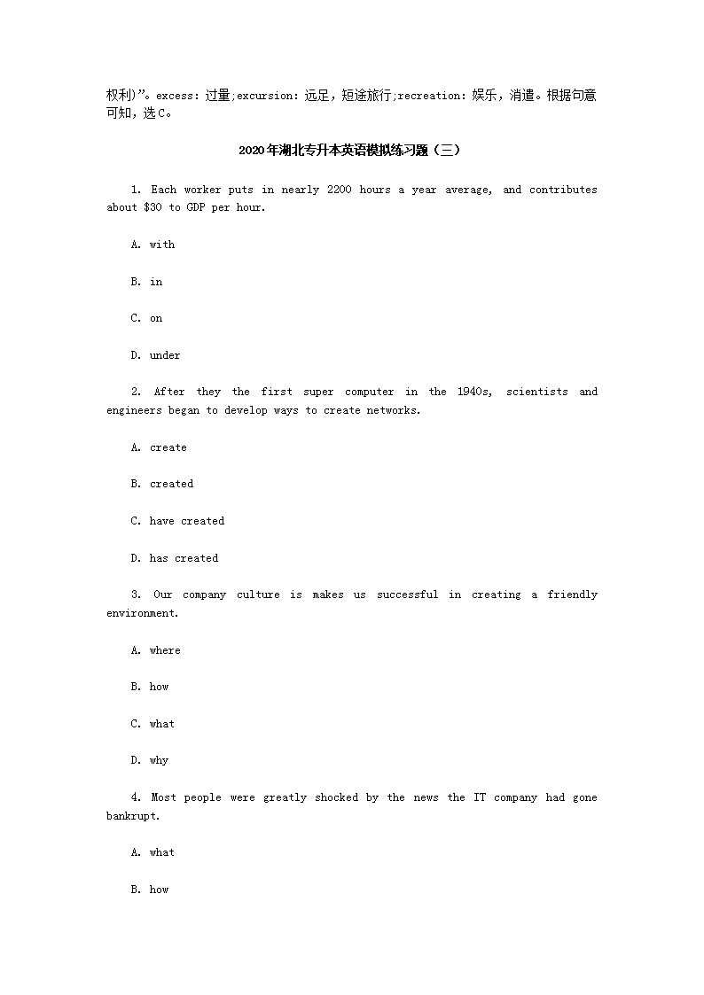 【文档名称】 2020年湖北专升本英语模拟练习题三套(Word版).doc