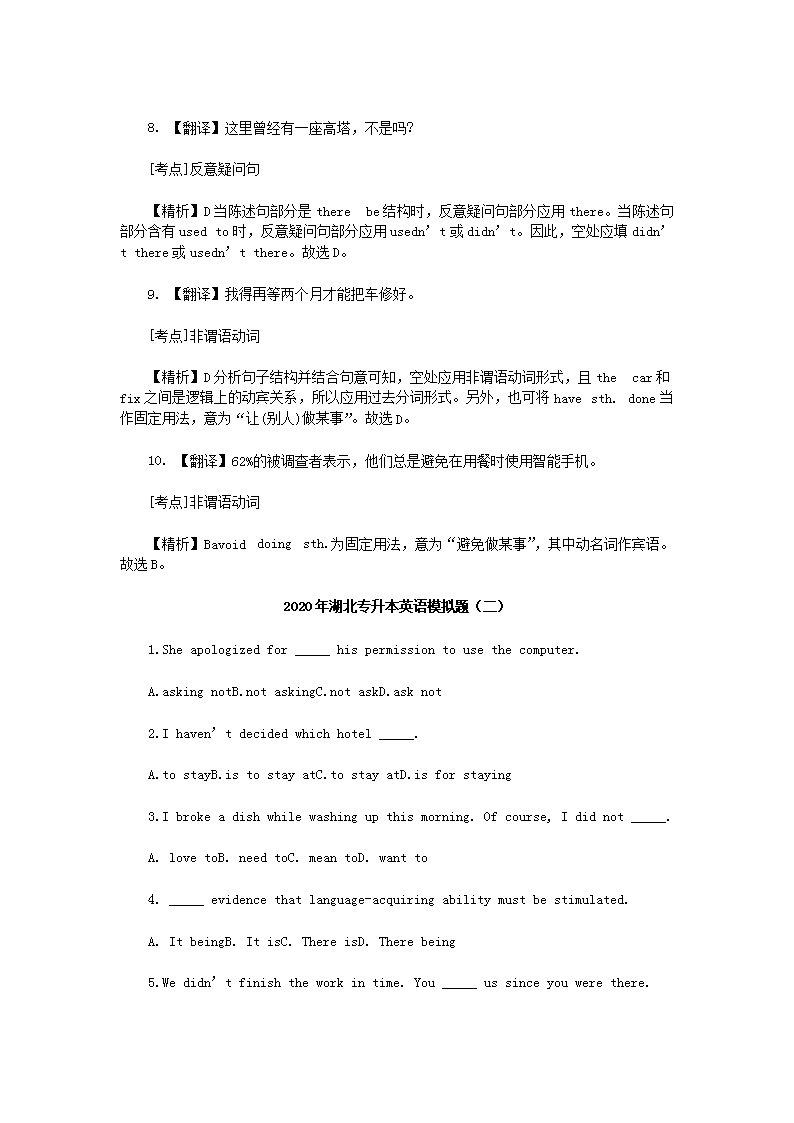 【文档预览】 无忧考网整理发布2020年湖北专升本英语模拟题三套(Word版),前五页预览如下: