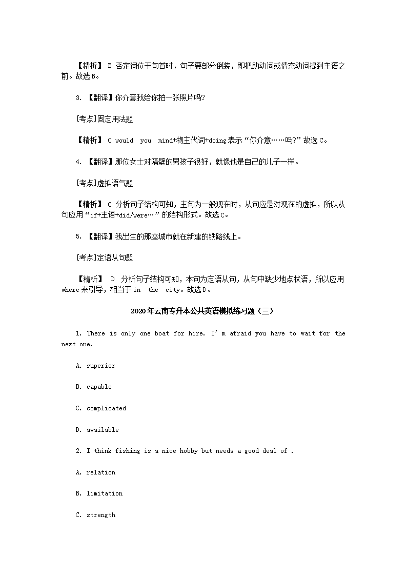 【文档名称】 2020年云南专升本公共英语模拟练习题三套(Word版).doc