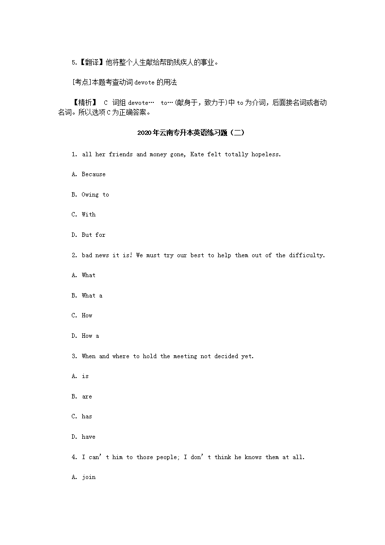 【文档预览】 无忧考网整理发布2020年云南专升本英语练习题三套(Word版),前五页预览如下: