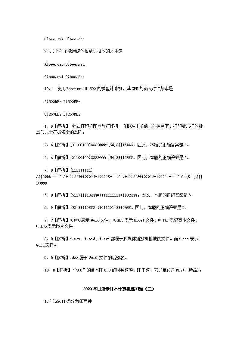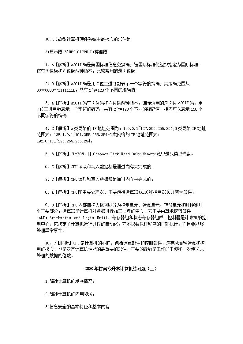 【文档名称】 2020年甘肃专升本计算机练习题三篇(Word版).doc